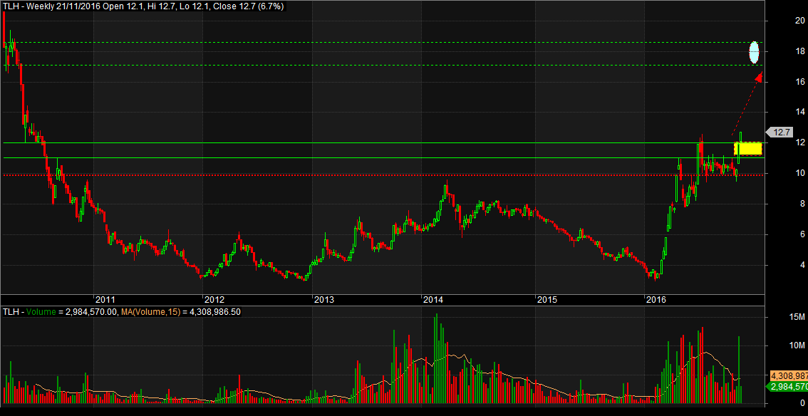 Sau khi đi ngang tích lũy 5 tháng từ tháng giữa tháng 7 tới ngày 14/11 trong vùng giá dao động từ 10 – 11. TLH phá khỏi trend ngang vào ngày 15/11/2016, sau đó tiếp tục vượt phá đỉnh trung hạn 12, với cây nến xanh dài – marubozu, kèm theo khối lượng lớn. Xác lập chính thức một xu hướng tăng mới.