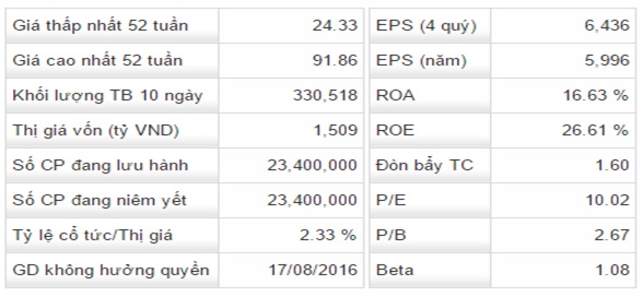 Tính đến ngày 22/08/2016 KSB đang được giao dịch ở mức giá 64,5 với P/E cơ bản 10,02 lần và P/B 24,18lần.