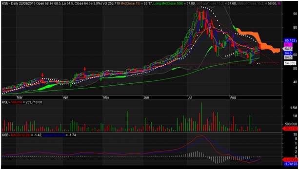 Echimoku Kinko Hyo :Sau 1 đợt giảm sâu kể từ ngày 13/07/2016 đến ngày 15/08/2016, KSB đã bắt đầu có dấu hiệu hồi phục trở lại khi phá vỡ trend giảm trước đó và quay đầu lên trên. Volume vào ngày 15/08 cũng tăng đột biến so với những ngày trước đó cho thấy lực mua trên thị trường đã có nhiều thay đổi theo hướng tích cực. Cây nến đỏ vào ngày 22/08 đã mấp mé mây đỏ và có khả năng đi ngang xuyên mây trước khi bức phá tăng lên trong những phiên sau. Tuy rằng mây đỏ vẫn còn bao khá dài theo hướng giảm của đường giá, nhưng những dấu hiệu về thanh khoản và thông tin tốt từ báo cáo tài chính sẽ hỗ trợ KSB vượt khỏi vùng mây ảm đạm để hồi phục trở lại.