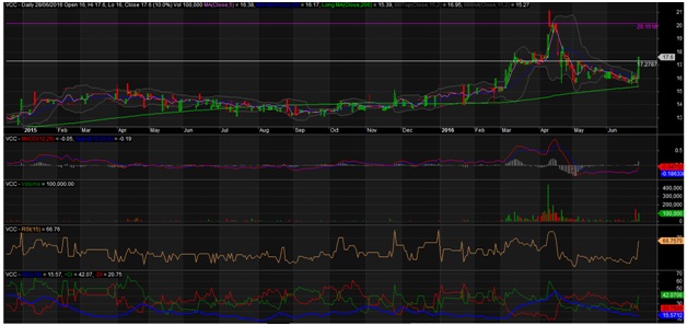 Phiên hôm qua là 1 phiên breakout khá ấn tượng, trước đó VCC tạo đỉnh vào tháng 4/2016 phân phối và giảm giá sau đó tạo nền tích lũy với Volume nhỏ. Phiên hôm qua Break đi kèm volume đủ thuyết phục, cộng hưởng sự ủng hộ của các chỉ báo MACD cắt từ dưới nên, và đang có đà vượt 0, RSI chỉ cố 66,7, ADX 22.2 ( +DI cắt lên trên –DI).