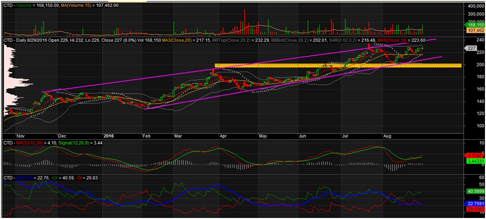 - Giá hiện tại là 227.000 đ/cp , đang nằm trong vùng giá cao nhất (sau chia tách) của CTD từ khi lên sàn. Phiên hôm qua ( 29/08/2016) CTD đang có dấu hiệu test lại đỉnh ở vùng giá trên 228.000 với khối lượng khá đẹp nhưng không thành công, lý do có thể do tác động tâm lý chung do toàn thị trường bị bán xuống cuối phiên. Tuy nhiên quan điểm của người viết thì nếu không có tác động đó thì khả năng CTD sẽ vượt đỉnh thành công, do đó trước mắt có thể CTD sẽ có một vài phiên điều chỉnh hoặc đi ngang tích lũy cho nhịp tăng vượt đỉnh kế tiếp.