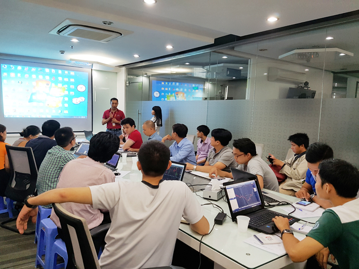 Lớp có 25 học viên - hình chụp này không dính những bạn ngồi cuối lớp, để ý sẽ thấy lap của bạn cuối mép ảnh đang mở amibroker (hình dưới)