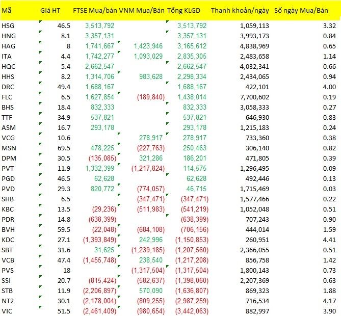 - Thêm mới: DRC, HSG do đã đạt đầy đủ 3 điều kiện về vốn hóa, thanh khoản và freeloat trong kì này. Ngoài ra, cổ phiếu CSM đã đạt điều kiện freeloat và thanh khoản, nếu giá CSM tăng lên 32.5 sẽ đạt điều kiện vốn hóa sẽ được xem xét được vào FTSE, CSM sẽ được mua ~3 triệu cp.