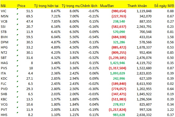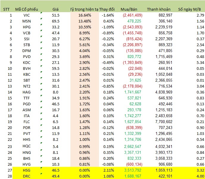 - Thêm mới: không có .Cổ phiếu TTF và HSG đã đạt điều kiện freeloat và vốn hóa nhưng chưa đạt điều kiện thanh khoản nên chưa được xem xét vào rổ trong kì này.